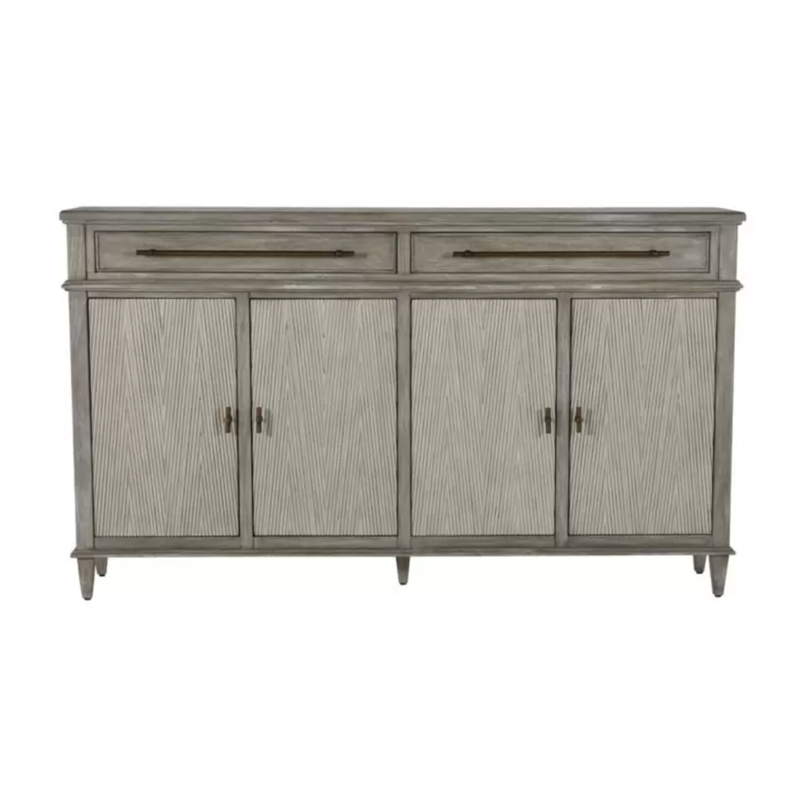 The Isaac Long Cabinet combines slim design with classic style, featuring a Mindy wood construction with a brushed gray and sesame white finish, highlighted by antique bronze accents. Its unique ribbed V-pattern doors offer visual intrigue, while the slim 14" depth makes it a perfect fit for tight spaces. Ideal for stowing away clutter or organizing essentials, it brings functional elegance to any room without occupying too much space.